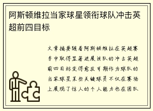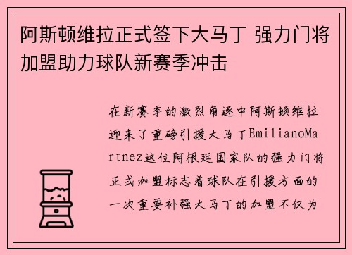 文章摘要:阿斯顿维拉作为英格兰历史悠久的足球俱乐部,近年来的表现引发了外界对于其能否被视为英超强队的讨论。本文将从四个关键方面分析这一问题:首先是阿斯顿维拉的球队实力和阵容深度,其次是球队的战术体系和教练策略,再者是其在英超联赛中的稳定性和竞争力,最后将从俱乐部的资金状况和未来发展潜力进行综合分析。...